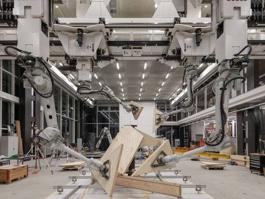 Im Gegensatz zur traditionellen Holzbauweise hat die robotische Fertigung mehrere Vorteile: Zum einen nehmen die Roboter dem Menschen das schwere Heben und das exakte Positionieren ab, zum anderen kann im Montageprozess auf aufwendige, ressourcenintensive Unterkonstruktionen verzichtet werden.