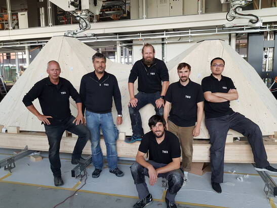 Stets im Gleichtakt nehmen vier hängende Roboterarme die ihnen zugewiesene Holzplatte auf, führen einen hochpräzisen Tanz aus und platzieren die Platten schliesslich gemäss Computerentwurf im Raum. Ein Algorithmus berechnet die Bewegungen der Roboter so, dass es dabei zu keinen Kollisionen kommt. Haben die Maschinen ihre vier Platten nebeneinander platziert, werden diese von Handwerkerinnen und Handwerkern zuerst temporär verbunden und danach mit einem TS3-Giessharz miteinander verbunden. Die Brettsperrholzplatten können so durch Fugenverguss ohne Pressdruck stirnseitig miteinander verbunden werden. Timbatec entwickelte dieses Verfahren in mehreren Forschungsprojekten mit der ETH Zürich und der Berner Fachhochschule. Heute wird es vorwiegend für die Konstruktion von Geschossdecken angewendet, ermöglicht aber auch Strukturen wie Semiramis. So werden zwischen 51 und 88 solcher Holzplatten zu einer Holzschale zusammengefügt.