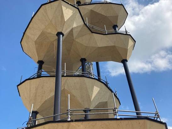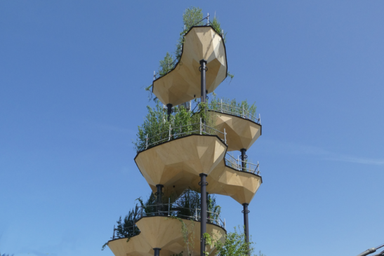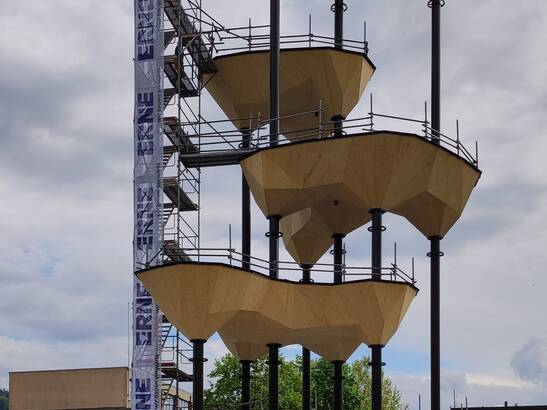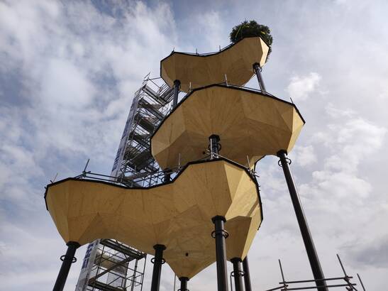 Für den Tech Cluster Zug bauten Forschende aus der Gruppe der ETH-Architekturprofessoren Fabio Gramazio und Matthias Kohler zusammen mit Müller Illien Landschaftsarchitekten, Timbatec und weiteren Partnern eine bepflanzte architektonische Skulptur. Die 22,5 Meter hohe Struktur besteht aus fünf geometrisch komplexen Holzschalen, die – leicht zueinander versetzt – von acht schlanken Stahlstützen getragen werden. Letzte Woche wurde mit allen Beteiligten das Aufrichtfest gefeiert.