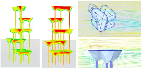 Die robotische Vorfabrikation läuft derzeit auf Hochtouren. Die einzelnen Schalensegmente wurden laufend auf Lastwagen nach Zug überführt und die architektonische Skulptur dann im Frühjahr 2022 aufgerichtet und schliesslich bepflanzt. Ab Sommer 2022 wird es möglich sein, die Holzstruktur vom Boden und den Gebäuden aus zu betrachten und einen Blick in die begrünten Schalen zu erhaschen. Die schlanke und hohe Struktur wird üppig mit grossen Büschen und Bäumen bepflanzt und hat damit ein stattliches Eigengewicht. Gleichzeitig stellt sie eine grosse Angriffsfläche für den Wind dar. Dank der vorteilhaften runden Form der Schalen wird dieser um die Konstruktion geleitet. Trotzdem ist die Aussteifung der Konstruktion mit den acht schlanken Stützen eine Herausforderung. Die Winddrücke auf die Schale wurden mit einer strömungsmechanischen RWIND Simulation von Dlubal Software berechnet, was die Umströmung der Konstruktion in einem Windkanal simuliert. Zusätzlich mussten wegen der schlanken Konstruktion Resonanzeffekte längs und quer zur Windrichtung in den Berechnungen berücksichtigt werden.