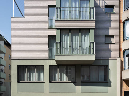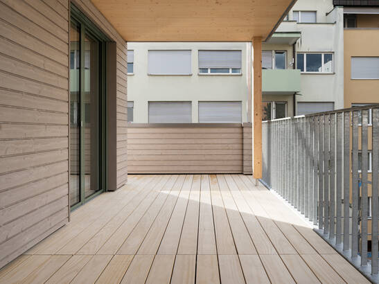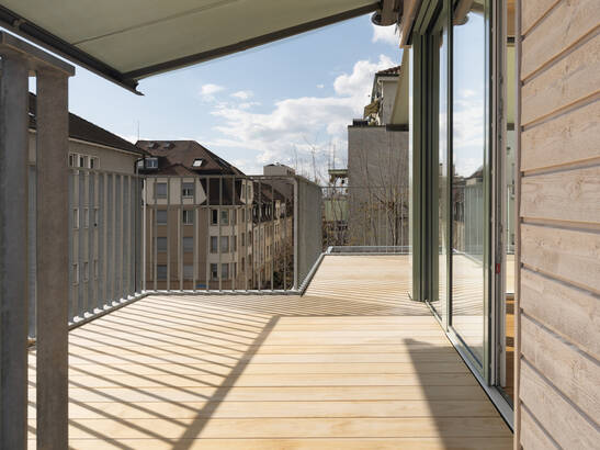 Holz hat sich nicht nur wegen seiner ökologischen Vorteile als Baustoff angeboten, sondern auch wegen seines geringen Gewichts. Der Holzbau sollte sich, wie eben schon angedeutet, im städtischen Kontext nach aussen hin zeigen und ablesbar sein, um die Bauhistorie des Gebäudes sichtbar zu machen. Aus diesem Grund wurde Holz im Aussenbereich als Fassadenmaterial und weiter auch für die Bodenbeläge der Terrassen und Balkone eingesetzt.