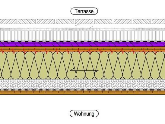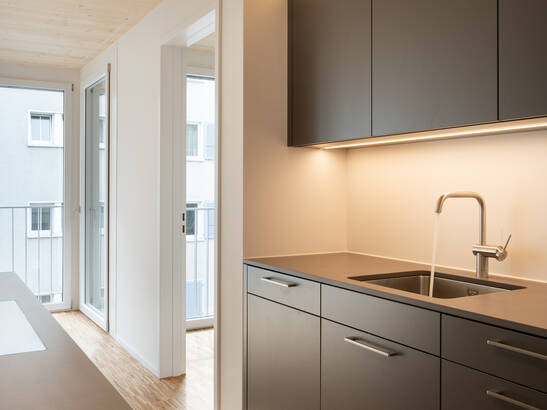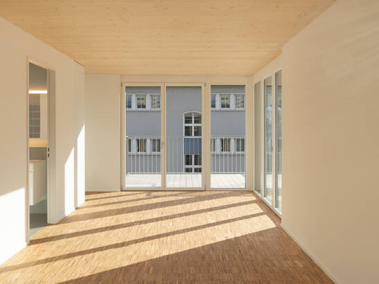 Für die Konstruktion der Geschossdecken wurden Hohlkastenelemente mit einer Spilttfüllung und Mineralwolle im Deckenelement gewählt. Diese Holzdecken bleiben in den Wohnungen sichtbar und verleihen den Räumen eine angenehm wohnliche Atmosphäre. Auch schalltechnisch schneidet die Konstruktion sehr gut ab.