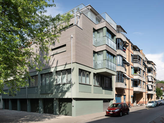 Wegen des geringen Gewichtes ist Holz für Aufstockungen fast immer die richtige Baustoffwahl. Die schnelle und lärmarme Bauweise mit Holz überzeugt bei An- und Umbauten. englerarchitekten gmbh sia haben ein Garagen- und Werkstattgebäude am Giessliweg in Basel saniert und mit drei Geschossen aufgestockt (farbig hinterlegt). Dabei haben sie viel Holz eingesetzt und sind mit der besonderen städtebaulichen Situation bestmöglich umgegangen.