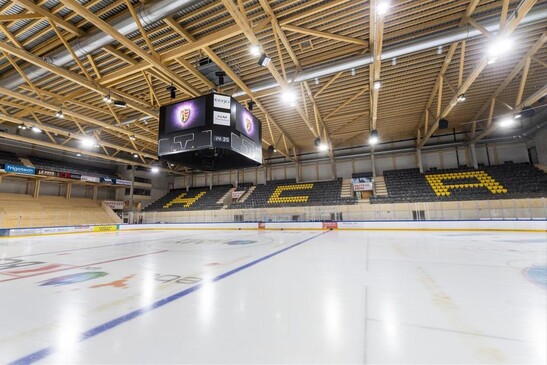 Das fertige Eisstadion mit Holztragwerk und Tribüne aus Holz ist bereit für seine Einweihung