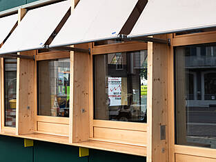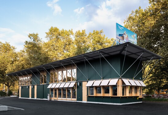 Angesichts der begrenzten Nutzungsdauer des Gebäudes (ca. 10 bis 15 Jahre) wurde auf eine hohe Rückbaubarkeit geachtet. Die Konstruktion ist so gestaltet, dass sie problemlos in Einzelteile zerlegt und recycelt werden kann. So wurden keine Verbundmaterialien oder Klebeverbindungen verwendet, sondern möglichst gut trennbare Einzelkomponenten.