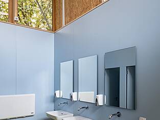 Das Projekt wurde mit einem engen Budget und einem Design-to-Cost-Mandat umgesetzt. Das Materialkonzept ist bewusst einfach gewählt: günstige Materialien wurden verwendet, aber durch farbliche Akzente und sorgfältige Detailarbeit erzielt das Gebäude dennoch eine ansprechende Wirkung. Die sichtbare Technik, wie Leitungen an Decken und Wänden, unterstreicht die schlichte Ästhetik.