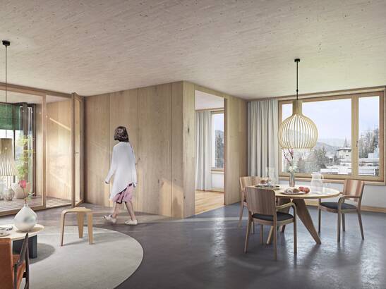 Die Geschossdecken werden in Brettsperrholz ausgebildet, die Stützen in Holz. Im durchlaufenden Stützenraster gelangt die TS3-Technologie zum Einsatz und bietet maximale Flexibilität in der architektonischen Gestaltung der Innenwände in Leichtbauweise. Der 5-geschossige Baukörper wird durch den Einsatz einer Holzfassade mit vertikaler und horizontaler Gliederung städtebaulich das Areal Du Lac in St. Moritz bereichern. Die Werkplanung sowie die Vorfabrikation soll von April bis August 2025 erfolgen, so dass in den Monaten September und Oktober 2025 die Holzkonstruktion aufgerichtet werden kann.