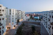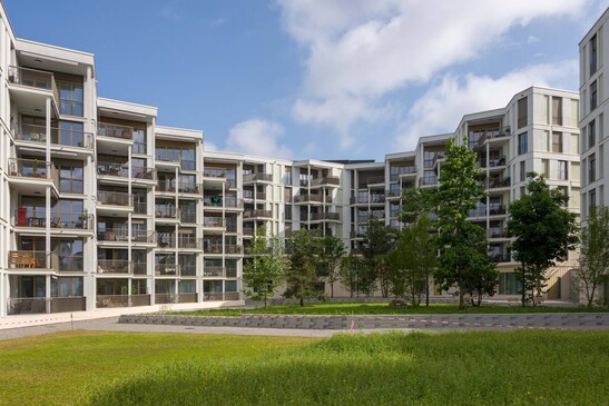 Am hochfrequentierten Bucheggplatz entstanden attraktive Genossenschaftswohnungen mit mehr Wohnraum. Dank erhöhter Ausnutzungsziffer und revidierter Bauordnung, sind die Gebäude grösser und höher als die Vorgängerbauten. Räume wie Küchen, Esszimmer und Treppenhäuser sind der Strasse zugewandt. Somit sind die privaten Wohn- und Schlafzimmer besser vor Lärm geschützt. Der Grundriss ist so gewählt, dass frontale Einblicke in die gegenüberliegenden Wohnungen vermieden werden. Richtung Süden öffnen sich die Wohnungen zu einem grosszügigen Innenhof, der vor Strassenlärm optimal geschützt ist.