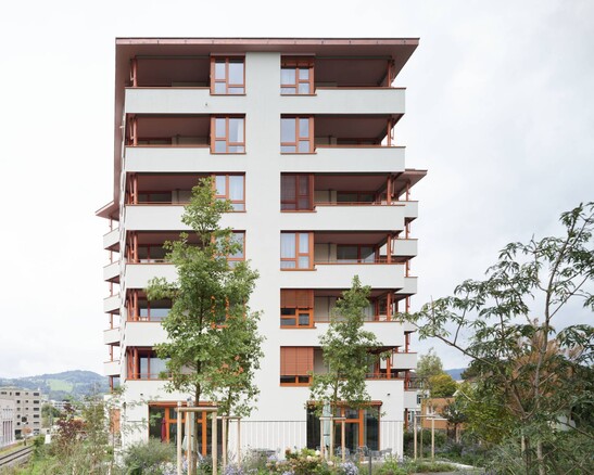 Zimmer-Wohnungen und einer 4.5-Zimmer Hauswartwohnung. Das Punkthaus orientiert sich mit zwei Sockelgeschossen zur Talstrasse hin und mit einem Gartengeschoss zur bestehenden Siedlung.
