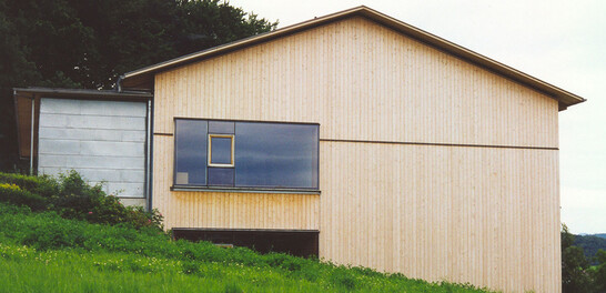 Durch die Vorgabe, dass kein Unterzug sichtbar sein dürfe, wurde dieser in die Konstruktion integriert. Tragendes Element sind Kastenträger aus Dreischicht-Platten und Brettschichtholz-Rippen. Der Gruppenraum-Anbau wurde als Holz-Elementbau erstellt.