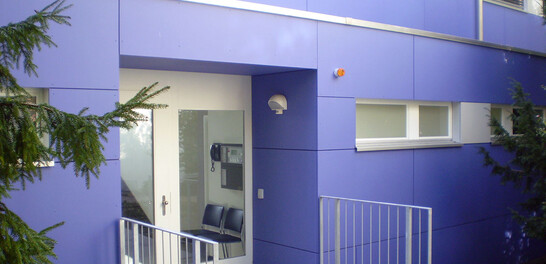 Im vorderen Bereich des Gebäudes wurden direkt auf die Stützmauer erhöhte Punktauflager einbetoniert. Die ganze Lastverteilung auf die Fundamente erfolgt über einen Stahlträgerrost, der über die Bodenelemente des Erdgeschosses getragen wird. Der darüber liegende Aufbau wurde in herkömmlicher Rahmenbauweise erstellt, wobei die Innenwände nicht tragend ausgebildet wurden. Besondere Aufmerksamkeit erforderte das Brandschutzkonzept und die Fluchtwege, die alle strikt eingehalten werden mussten. Die Fassade aus zementgebundener Spanplatte (nbb) trägt den teilweise unterschrittenen Normgebäudeabständen Rechnung. Ein zwei Meter vorstehender Wandriegel verhindert bei geringstem Gebäudeabstand einen Brandübergriff auf die Fensterfront.