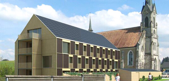 Das Mehrfamilienhaus Kraftwerk B befindet sich im Dorfzentrum von Bennau/SZ, direkt neben der katholischen Kirche. Es ist das 1. Plusenergiehaus der Schweiz, das heisst es produziert mehr Energie als es verbraucht.