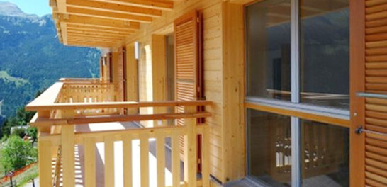 Das Chalet Schwarzbirg steht in steilem Gelände in Wengen im Berner Oberland. Das Mehrfamilienhaus besteht aus einem massiven Untergeschoss und 3 Vollgeschossen über Terrain in Holzbauweise.
