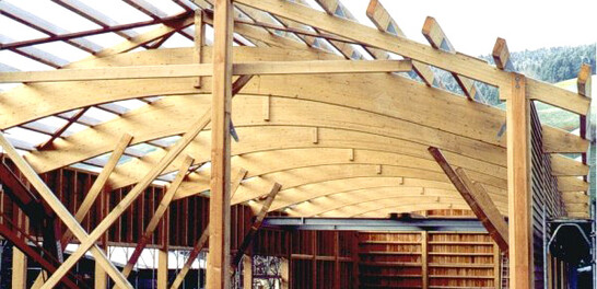 Die etappenweise Überbauung der Fläche mit Hallen sollte jederzeit die Bewirtschaftung des Rundholzplatzes ermöglichen. Das gewählte Konzept sieht eine Halle quer zur Achse von Bahn und Strasse vor, die in beiden Richtungen erweitert werden kann. Mit einem Grundraster von 14 x 55 m wird nur die erste von vier Hallen erstellt.  Die Einzelheiten  Das Tragwerk wurde auf einem Raster von 5.00, bzw. 5.50 m aufgebaut, um für die Massivholz-Sparrenpfetten noch wirtschaftliche Querschnitte zu erhalten.