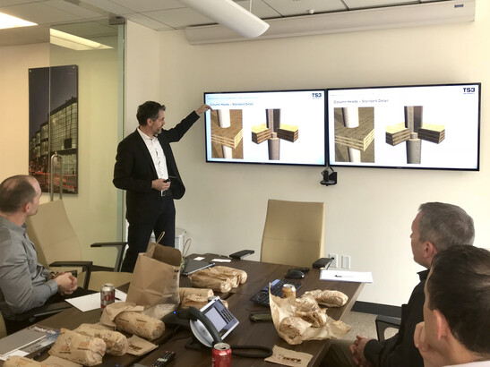 Un contact important aux États-Unis est pour les TS3, l'ingénieur Dean Lewis de DCI Engineers à San Francisco. Herzog et Zöllig connaissent l'Américain depuis leur visite à la conférence de l'année dernière. conférence à Portland et ont pu lui faire découvrir la technologie TS3. convaincre. Pour Lewis, il est clair que cette technologie ouvre de nouvelles perspectives à la construction en bois. ouvrira de nouvelles possibilités.