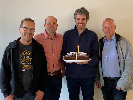 Marcel Herzog, Steffen Franke, Stefan Zöllig et René Wicki avec un gâteau d'anniversaire avec un joint TS3.