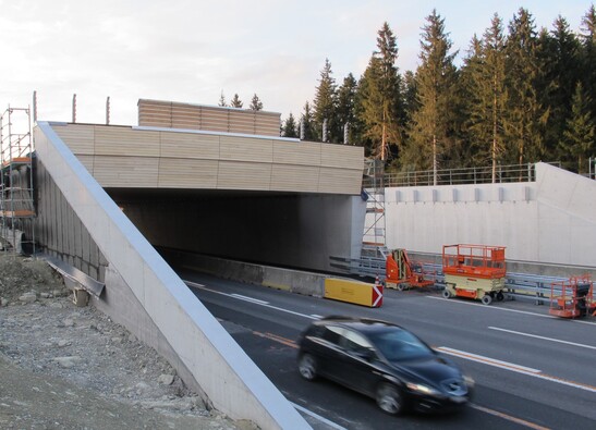 Dès le début de l'été, les automobilistes verront automobilistes verront ce portail de pont avant de passer sous le pont en bois. Les coûts de la passage supérieur pour la faune s'élèvent à environ 10,7 millions de francs.