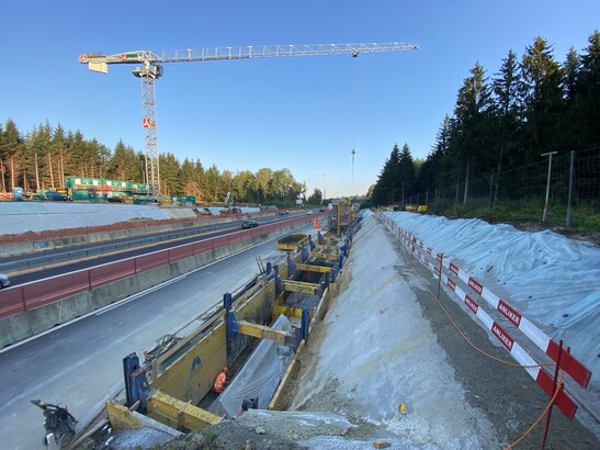 Dans le L'étape suivante consiste à poser les poutres en bois pour recouvrir la deuxième voie de circulation. sont installées. Pour les travaux de montage de la charpente en bois une modification de la circulation est nécessaire pendant la nuit. Depuis fin mars 2021 et jusqu'à mi-mai 2021, la circulation se fait de nuit sur une seule voie. sur une seule voie.