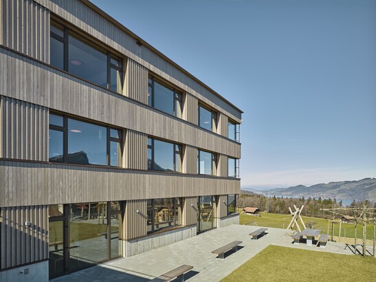 Le bâtiment scolaire a la particularité de pouvoir être La surélévation est déjà planifiée et peut être réalisée facilement car tous les éléments de construction sont dimensionnés de manière à ce que le bâtiment scolaire puisse être agrandi ultérieurement. d'un étage supplémentaire à une date ultérieure. Pour cela, les forces sont transmises par des piliers en bois qui s'étendent sur toute la hauteur du bâtiment et qui sont sont fixés en bas. En outre, les murs intérieurs ne sont pas porteurs. et permettent ainsi une flexibilité d'utilisation maximale.
