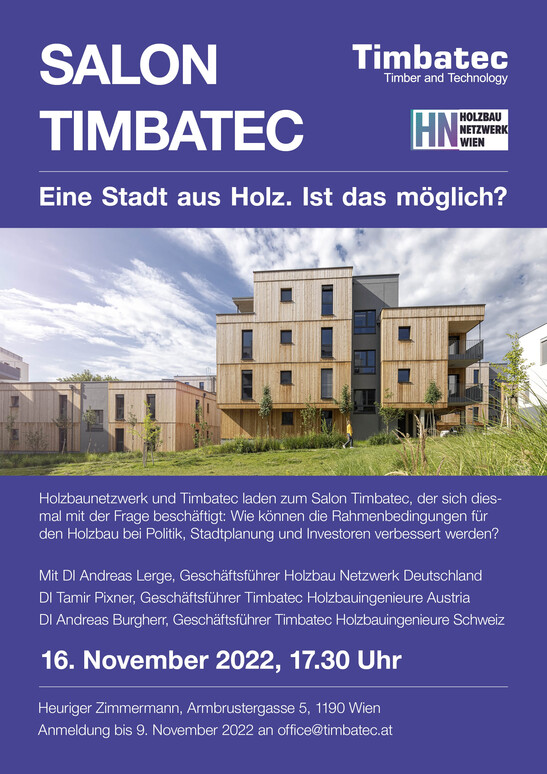 Holzbaunetzwerk et Timbatec invitent au salon Timbatec à Vienne, qui se penche cette fois sur la question : Comment améliorer les conditions cadres pour la construction en bois auprès des politiques, des urbanistes et des investisseurs ?
