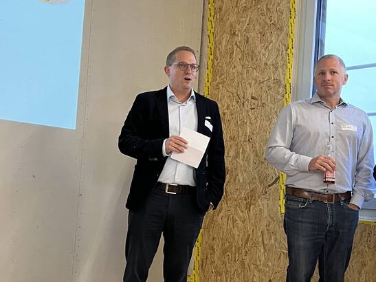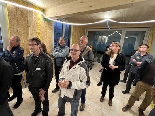 Le nouveau bâtiment «Scherli», construit en bois durable et selon les normes Minergie-P, convainc tant sur le plan esthétique que fonctionnel. Les visites guidées du bâtiment et les mots de bienvenue de Michael Leuenberger ont été suivis d'exposés introductifs des architectes (Adrian Habegger et Andy Plüss), du bureau d'ingénieurs en construction bois (Philipp Lutz et Lukas Rüegsegger) et de l'entreprise de construction bois (Nik Stuber).