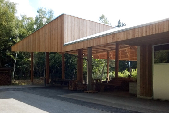 Dans les forêts communales pousse également du bois qui se prête idéalement à la construction. Ainsi, l'administration forestière a construit le nouveau dépôt de bois de chauffage entièrement en bois provenant du triage forestier. La structure porteuse est construite en rondins et se compose de neuf troncs entiers de douglas. Ces troncs ont été spécialement sélectionnés et abattus dans la forêt à cet effet.
