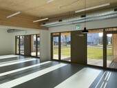 La maison Rümelbach à Rümlang est un nouveau bâtiment qui comprend plusieurs utilisations. Le plan allongé du bâtiment est divisé en deux parties par l'entrée commune. L'aile nord, qui comporte deux étages, abrite au rez-de-chaussée des salles de cours et de réunion. Le sous-sol, également accessible de plain-pied, abrite des salles pour un groupe de jeu. Au rez-de-chaussée, côté sud, se trouve le centre de rencontre pour les jeunes avec une salle de séjour et une cuisine.