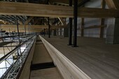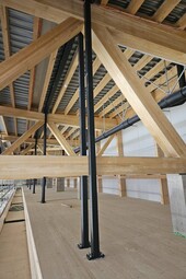 Un défi résidait dans la suspension des loges et la reprise des efforts supplémentaires induits dans les treillis existant. Les treillis ont été renforcées au niveau des raccords par un collage e-vissage de planches en épicéa de sorte à garantir la stabilité tout en préservant son esthétique.