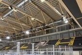 L’aménagement comprend neuf loges VIP pouvant chacune accueillir jusqu’à dix personnes, ainsi qu’un espace fondu ouvert pouvant recevoir une vingtaine d’invités. Les loges s’intègrent discrètement entre les poutres en treillis de la toiture existante. Cette implantation ingénieuse permet d’exploiter au maximum le volume disponible tout en préservant la légèreté visuelle de la structure. Les spectateurs bénéficient ainsi d’un point de vue exceptionnel sur la patinoire, dans un environnement à la fois chaleureux et exclusif, où le bois et le verre créent une atmosphère élégante et contemporaine.