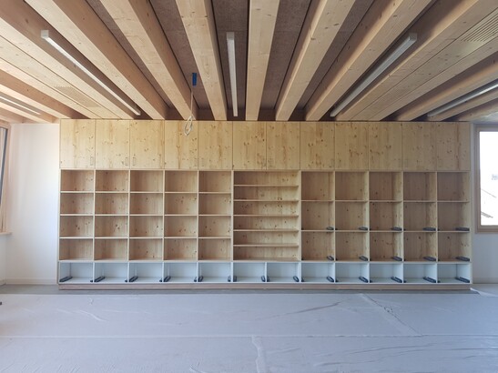 La première partie du centre scolaire de Courrendlin est terminée, les élèves du secondaire ont pris possession de leurs nouveaux locaux flambant neufs. Cette première partie concerne le bâtiment destiné aux élèves du secondaire avec une capacité de quinze classes supplémentaires, une seconde construction prendra place dans le même secteur et sera destinée à acceuillir les plus petits. Les structures porteuses verticales sont réalisées en béton armé et sont visibles depuis l'extérieur. Les dalles des différentes salles de classe ont été réalisées en bois et utilisé dans un circuit court. Elles sont soutenues sur des doublages réalisés en bois qui intègrent l'isolation thermique du bâtiment.