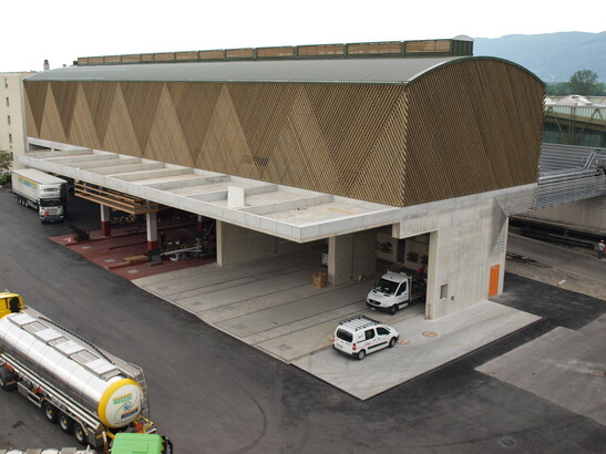 Le hall de stockage, 61 m x 16 m de surface au sol et 9,5 m de hauteur, a nécessité une subdivision de la longueur du hall en trois zones. La structure porteuse des murs extérieurs est une construction poteaux-traverses avec une largeur d'influence des piliers de 4,5 m. Les fermes et les éléments de toiture préfabriqués dans l'usine de Holzbau Moosmann AG (composés de 2 pièces en bois lamellé-collé) sont fixés sur les piliers des murs extérieurs. Les fermes en bois lamellé-collé ont été fabriquées par l'entreprise Stuber AG sous forme de fermes en arc. L'assemblage des coques de toit a permis un avancement rapide des travaux pendant le montage et a évité que les installations mises en place au préalable ne soient endommagées par les intempéries.