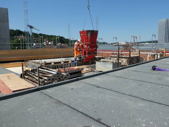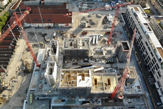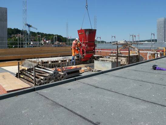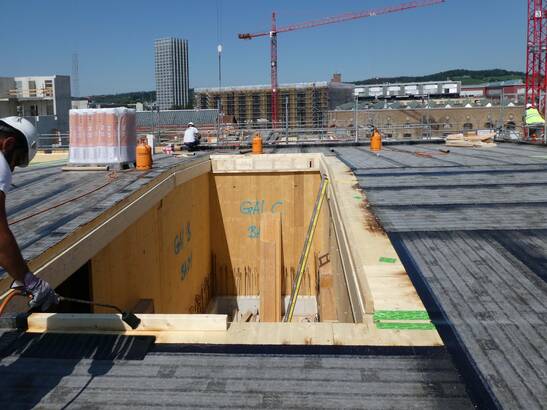 Les avantages de cette nouvelle approche sont évidents : il faut beaucoup moins de profilés en acier et de vis, la liaison entre la structure en bois et le noyau de béton est plus simple et le temps de construction est plus court. Le montage et le démontage de l'échafaudage et du coffrage pour le noyau de béton ne sont plus nécessaires et la quantité de béton utilisée peut être réduite. Et ce, à performance égale : le béton coulé ultérieurement est lié à la structure en bois par une liaison de forme et de force. Les noyaux des cages d'escalier servent au renforcement statique des bâtiments et garantissent les voies d'évacuation en cas d'incendie.