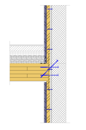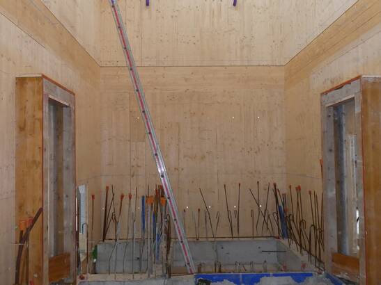 Les panneaux 3 plis de 42 millimètres d'épaisseur ont été recouverts de 3x15 millimètres de plaque de plâtre fibreuse du côté intérieur de la pièce pour assurer la protection incendie. De l'autre côté, la plaque sert de coffrage perdu pour le béton. Jusqu'à ce que le béton soit durci, la cage d'escalier est provisoirement renforcée.