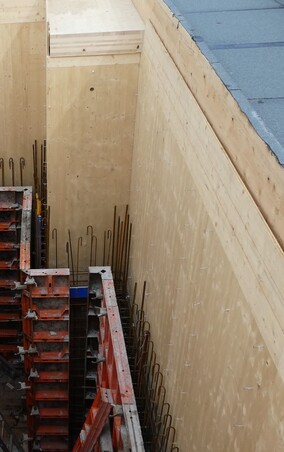 First wood, then concrete: The three-layer slabs are at the same time the inner wall and the lost formwork for the concrete concrete staircase core.