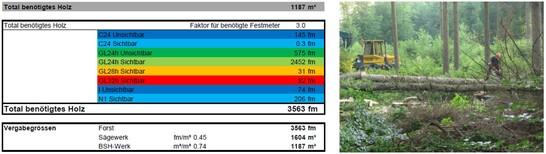 The planning of wood procurement from the from the forestry industry to the processing companies and the timber be well coordinated from the beginning. For this purpose, Timbatec has already planned at the beginning of 2019 the Timbatec determined the quantities of wood for the supporting structure, the building envelope and defined the required strength. It was also determined whether the wood would will ultimately be visible or not. With this information, the foresters can harvest the right wood from the forests.