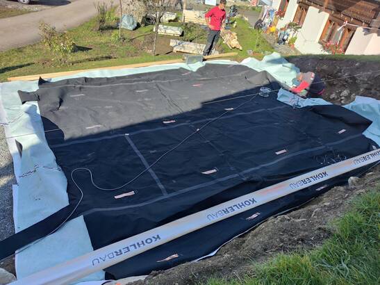The latest technologies are used in front of this house: Cross-laminated timber panels and the TS3 technology are used to create the floor slab and base walls of a garage, which stands in the ground on three sides. Thanks to several protective layers and moisture monitoring, wood can now be used in contact with the ground. For a long time, this was considered impossible. The combination of innovations from the fields of timber construction and flat roofs makes this new area of application possible. TS3 technology combines the CLT panels to form a stable monocoque box, various protective layers protect this - just like a flat roof, simply inverted and installed in the ground.