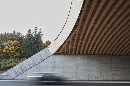 In the preliminary project phases, designs in concrete and wood were compared with each other. In addition to cost-effectiveness, the structure was to be low-maintenance and durable. A later expansion of the highway from two to three lanes was taken into account in the planning. It must be possible to guarantee the flow of traffic on the highway at all times, even during the construction period. Astra ultimately opted for the timber variant.