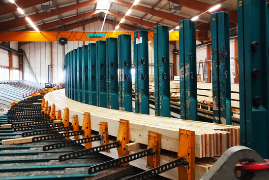 ARGE FERA was commissioned with the execution together with Aarvia Bau AG and Häring AG. The 156 BSH arch girders required were prefabricated at Hüsser Holzleimbau AG in Bremgarten. The girders are 17.4 meters long, have a cross-section of 24 by 76 centimeters and weigh two tons each. For this purpose, spruce boards were glued in a dimensionally stable manner using a large glue press and an RF adhesive. Steel joints on both sides of the girders serve as supports.