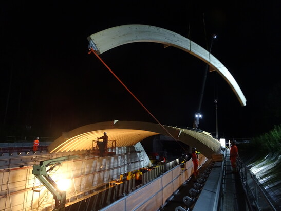 For the assembly of the supporting structure, the highway was reduced to two lanes during 24 nights from 9.30 p.m. to 4 a.m. each night. In the week of 26.10. - 30.10.2020, the sealing work was completed. Then, by the end of 2020, the wooden bridge will be completed with root protection film, seepage gravel, drainage mat and soil for planting.