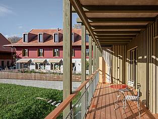 This year's Christmas message adorns the Hofwis Elsau health center and residential development. The architecture of the Hofwis development integrates itself into the central village location by incorporating elements of the existing farmhouse. The health center interprets a stately barn with a brick base and wooden facades, which emphasizes its significance for the community. Built sustainably, the new buildings combine the use of wood with minimal concrete and steel in order to conserve resources. A large photovoltaic system covers the building's own needs, powers heat pumps, charges electric cars and stores surplus electricity.