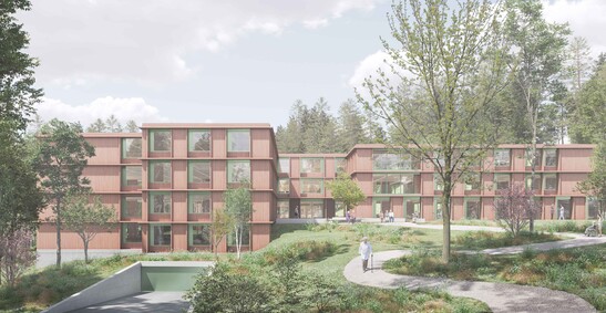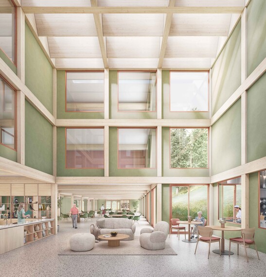 The planning team led by gdap architectes sàrl, Geneva, achieved 2nd place in the «EMS Alp'Age-PSVJ» competition with the «ELSA» project. The design is based on a clear timber construction method and harmoniously integrates the nursing home into the challenging topography and the surrounding educational and healthcare area.