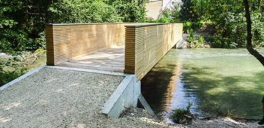 The new bridge had to fit onto the foundation of the original crossing, so the support situation of the abutments had to be taken over. The new bridge was designed as a trough bridge. The primary structure consists of two glulam girders. The steel cross girders are attached to the primary girders from below with glued-in threaded rods. Thanks to this flexurally rigid connection, the primary girder is stabilized and cannot tilt. The longitudinal girders of the carriageway are made of larch laminated timber, the decking of oak. With the new bridge, there is more space between the water and the bridge than before - an advantage during floods. Previously, there was a risk of driftwood piling up, damaging the bridge and flooding the adjacent land.
