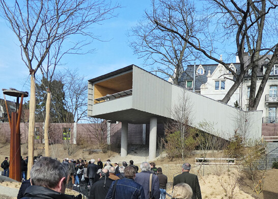The platform consists entirely of cross-laminated timber panels made of spruce and fir. The floor slab was clamped into the reinforced concrete columns via the longitudinal reinforcement. The clamping was done by bonding the reinforcement to the timber slab.