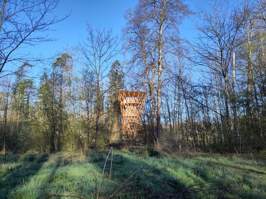 Completed in 2025, the observation tower is located on the left bank in the direction of flow of the Thur, as seen from the Ellikerstrasse bridge, directly on the riverbank. At 15 meters high, it is an imposing structure, but it blends seamlessly into the floodplain landscape. There are platforms at heights of eight and twelve meters where visitors can observe nature and enjoy the panoramic view. The project originated from a master's thesis at ETH Zurich.