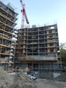 The four buildings are of hybrid construction. The stairwell core, interior columns and ceilings are made of reinforced concrete. The exterior walls are made of timber. The load-bearing columns are integrated into the frame construction walls and are offset as elements. The major advantages are that the elements form the end formwork and enable the timber and solid construction to be erected quickly and simultaneously.