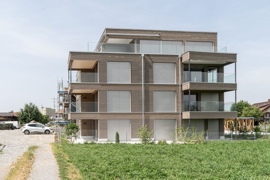 The buildings were constructed using sustainable timber element construction, with both the interior and exterior walls consisting of prefabricated timber elements. Horizontal glued laminated timber (glulam) was used for the floor slabs and the roof, which guarantees the required stability. This construction method combines ecological responsibility with modern living comfort and creates a healthy indoor climate.