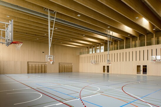 The new «Château d'eau» school complex in Marly has twelve classrooms, four kindergarten rooms and a double gymnasium. The school center is divided into three Minergie-P-Eco buildings in timber construction. Each building contains a specific program: