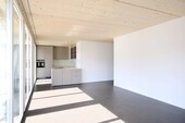 The apartment building in Dübendorf has a basement in reinforced concrete and 5 floors above in wood with a wooden staircase. There are a total of 5 apartments in the building on the ground and upper floors. The basement only contains cellars and technical rooms. The facade is partly covered with PV modules and horizontal timber cladding.