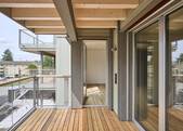 The ten-apartment building on Breitestrasse in Wallisellen is painted in a subtle sage green. The replacement building is a pure timber construction with four floors, including a wooden staircase.