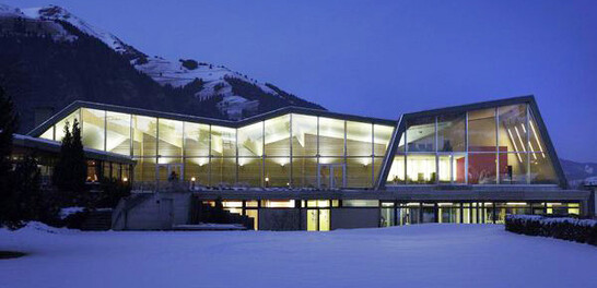 The main supporting elements of the roof consist of approx. 20 m long glulam beams. To make the view of the mountains even more inviting, the single-span girders were tapered towards the window front. The trusses are supported on pendulum columns and stabilized by the roof slab and walls. Tabs hidden in the wall structure provide the fork bearing.